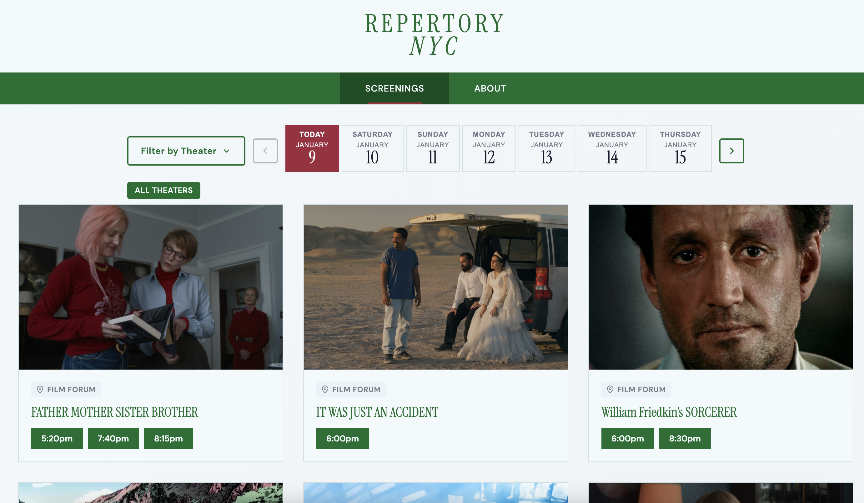 A site built out of my love for the New York arthouse/independent film scene. repertory.nyc aggregates screenings across different independent theaters in the city, allowing for easier navigation and discovery of the beauty that is New York film.